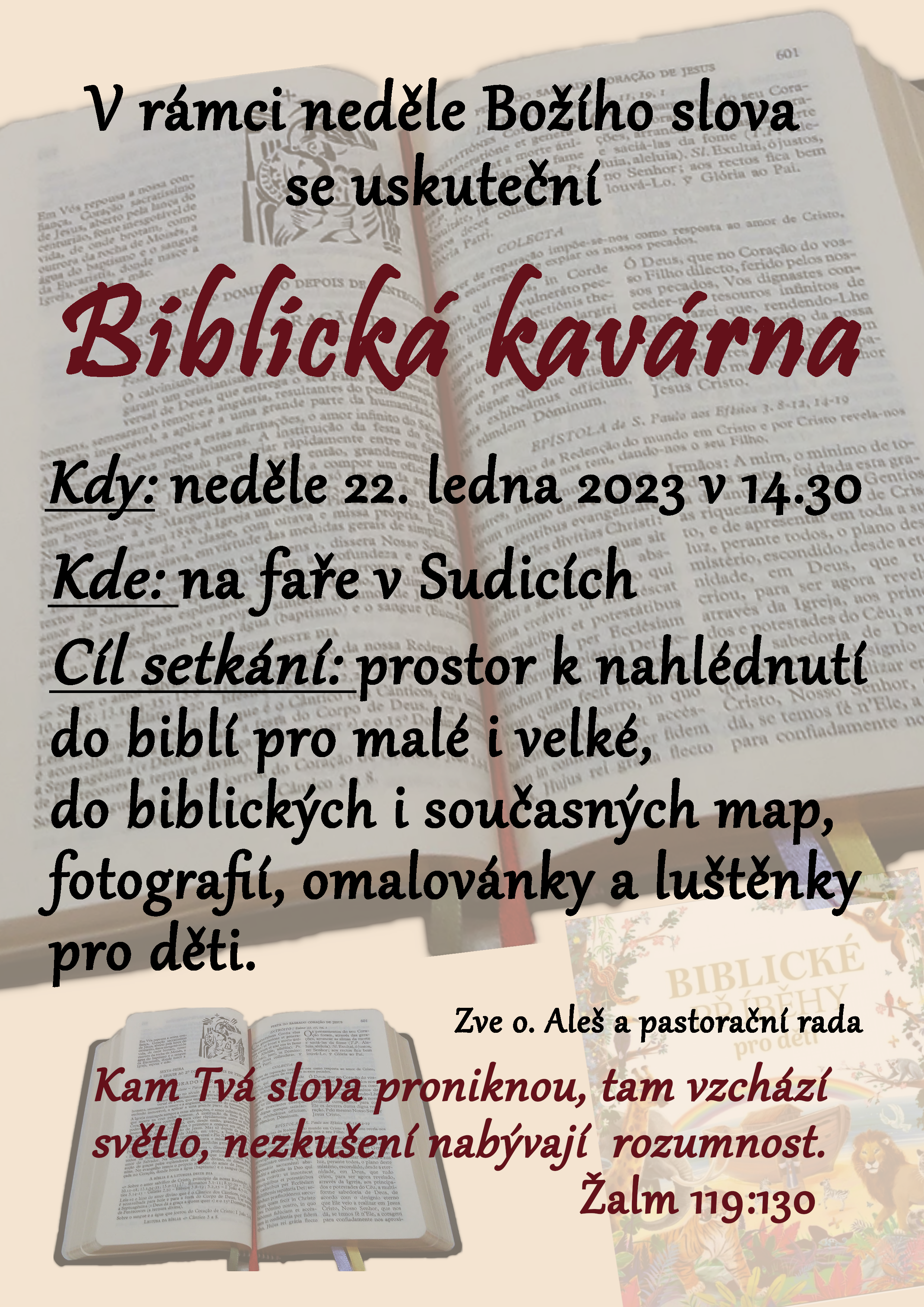 V rámci neděle Božího slova se uskuteční v neděli 22. ledna 2023 v 14:30 na faře v Sudicích Biblická kavárna.