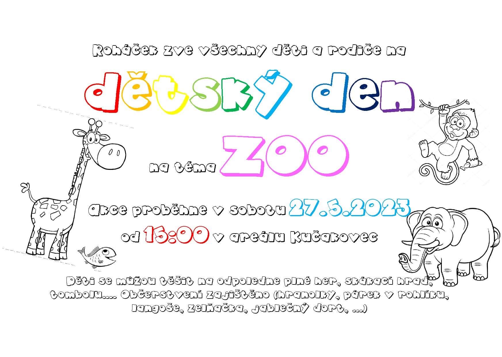 Roháček zve všechny děti a rodiče na dětský den na téma ZOO. Akce proběhne v sobotu 27. 5. 2023. od 15:00 v areálu Kučakovec. (viz. plakát)