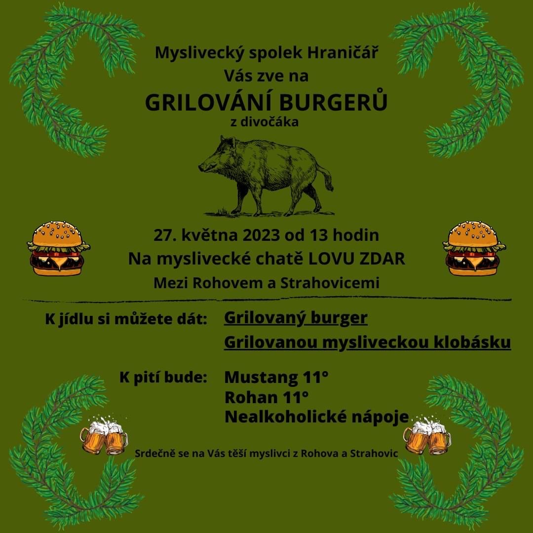 Myslivecký spolek Hraničář Vás zve na GRILOVÁNÍ BURGERŮ z divočáka, které se bude konat 27. května na myslivecké chatě LOVU ZDAR. (viz. plakát)