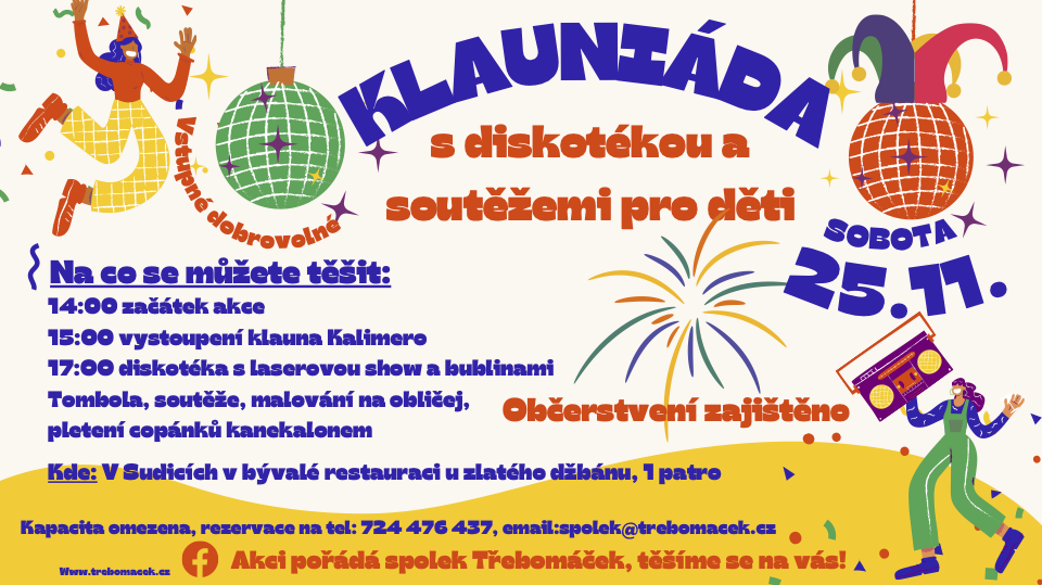 Spolek Třebomáček pořádá v sobotu 25.11. 2023 Klauniádu s diskotékou a soutěžemi pro děti. (viz. plakát)