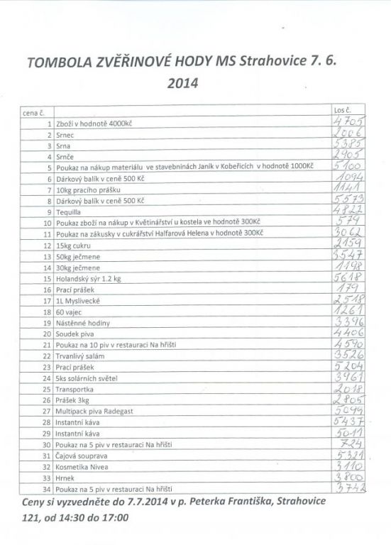 Myslivecké hody ve Strahovicích dne 7.6.2014 - losování