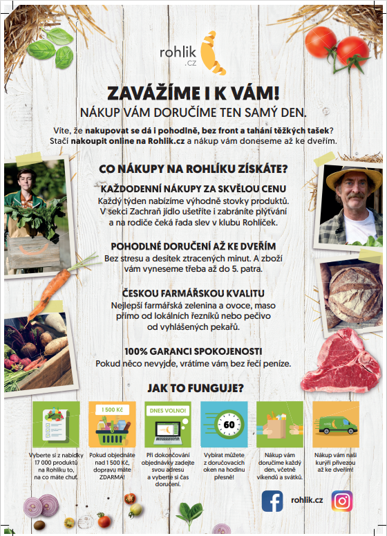 Od tohoto týdne začíná i v Rohově rozvážet nákupy Rohlik.cz. Díky tomu si můžete objednat domů nákup jako v žádném jiném supermarketu. Odlišují se velkou nabídkou převážně lokálních farmářských produktů (ovoce, zelenina, mléčné výrobky a maso).Více informací viz. plakáty.
