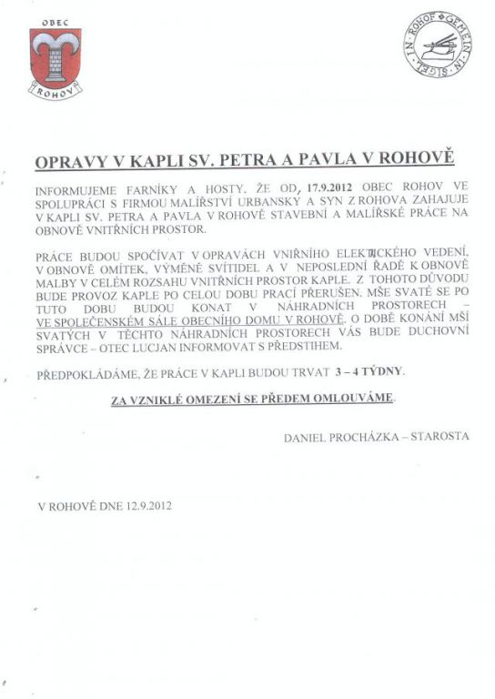Opravy v kapli sv. Petra a Pavla v Rohově !