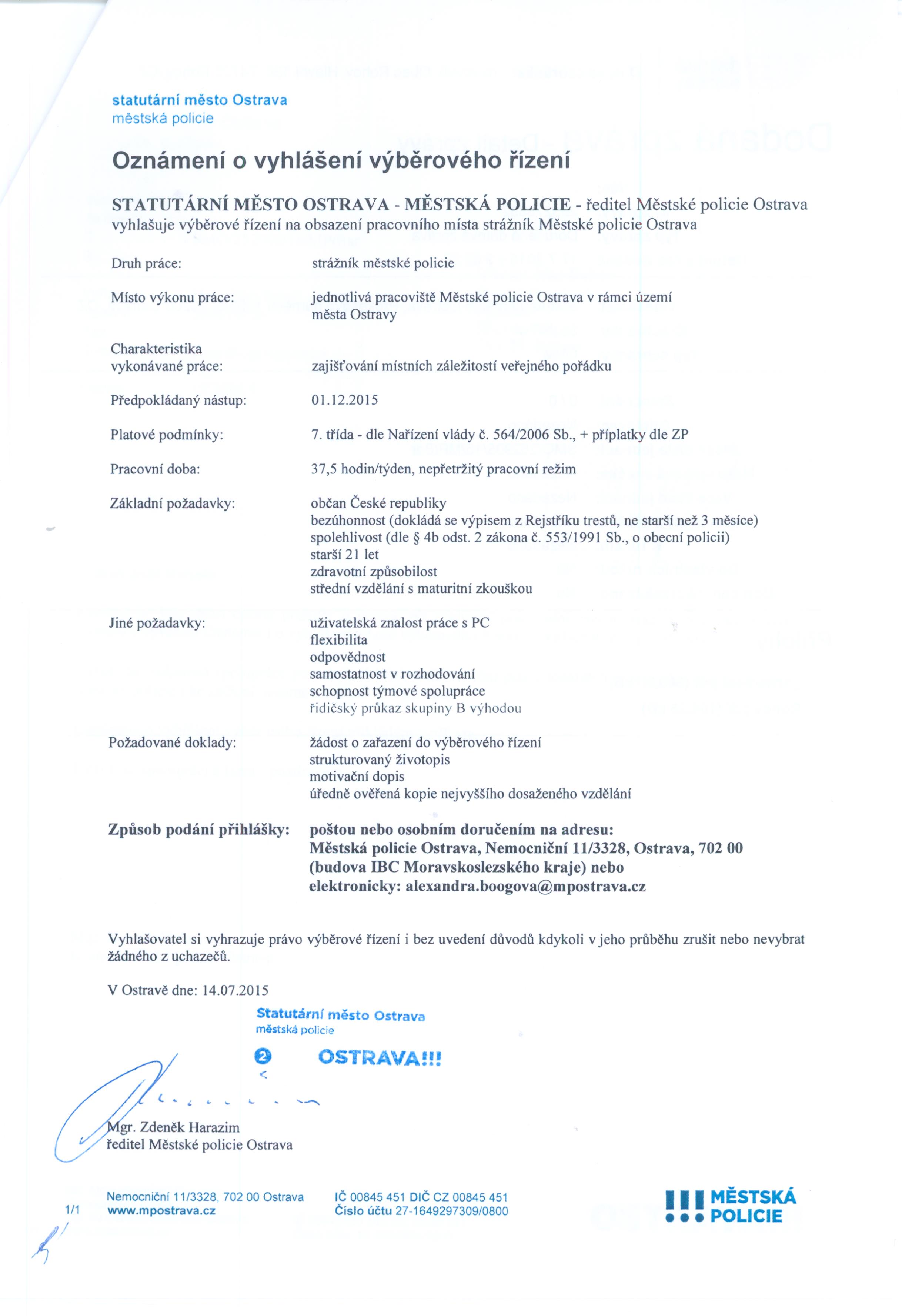 Oznámení o vyhlášení výběrového řízení na obsazení pracovního místa strážník Městské policie Ostrava