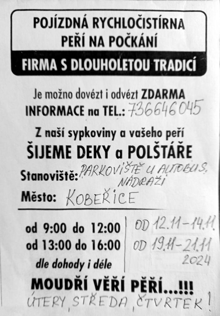 Na parkovišti u autobusového nádraží v Kobeřicích bude přistavena pojízdná rychločistírna peří. (viz. příloha)