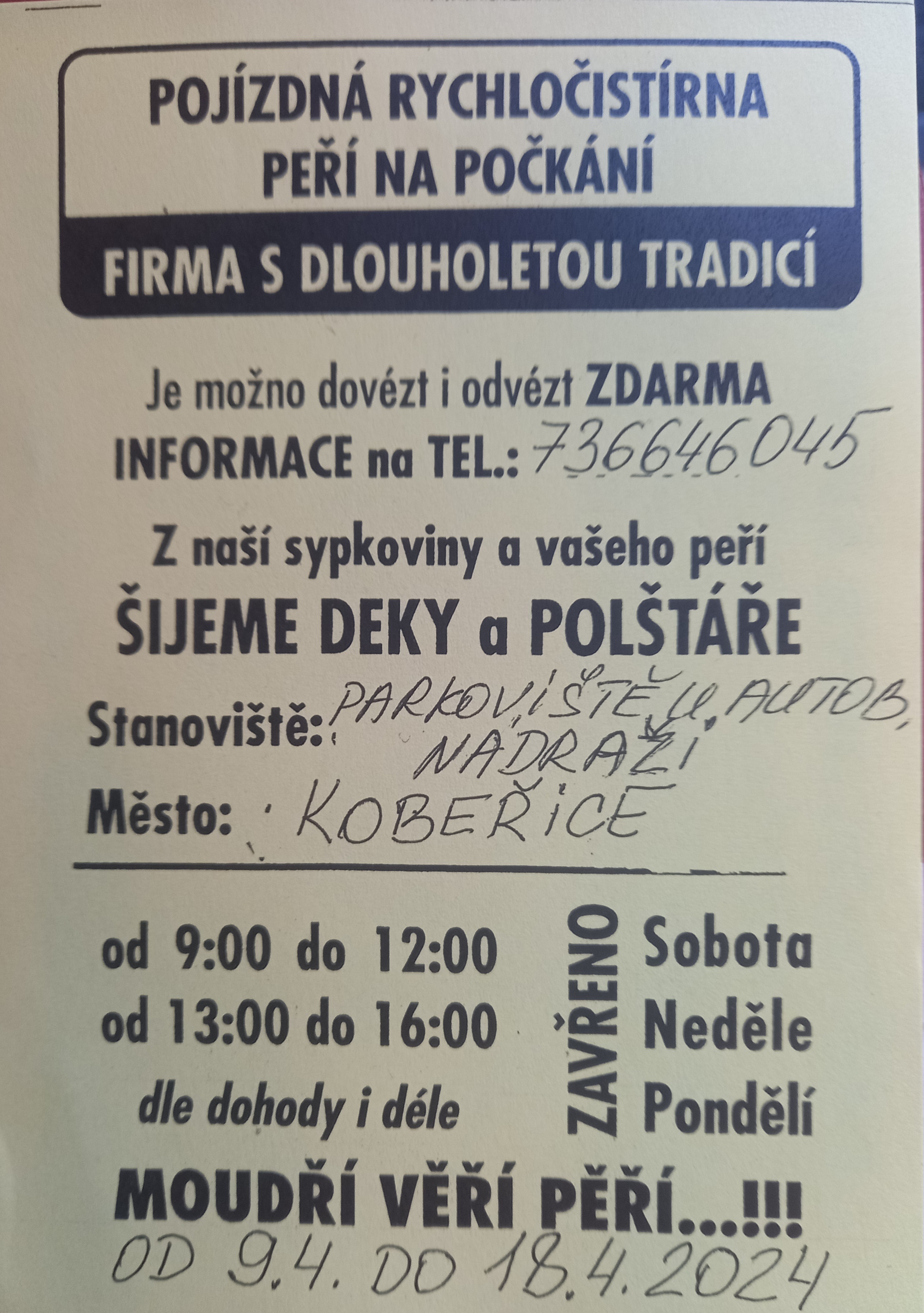 Pojízdná rychločistírna peří bude v Kobeřicích na autobusovém nádraží od 9. 4. do 18. 4. 2024. (viz. příloha)