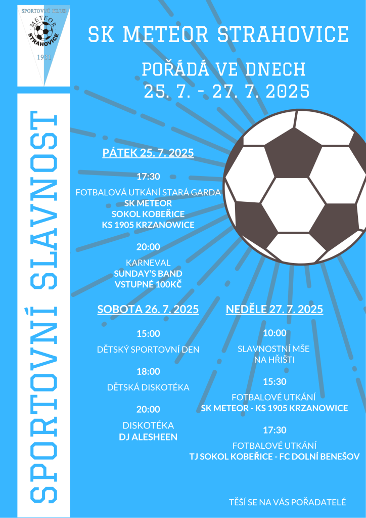 SK Meteor Strahovice pořádá ve dnech 25.7. - 27.7. 2025 Sportovní slavnost (viz. plakát)