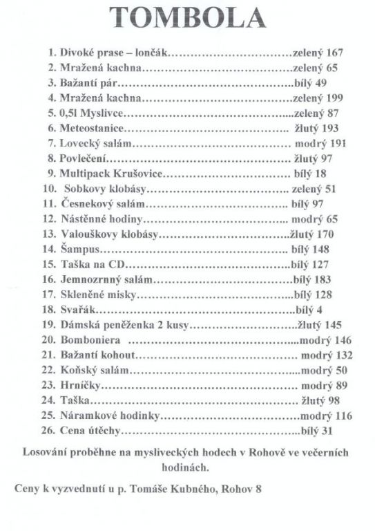 TOMBOLA - myslivecké hody 19.1.2013 Obecní dům Rohov