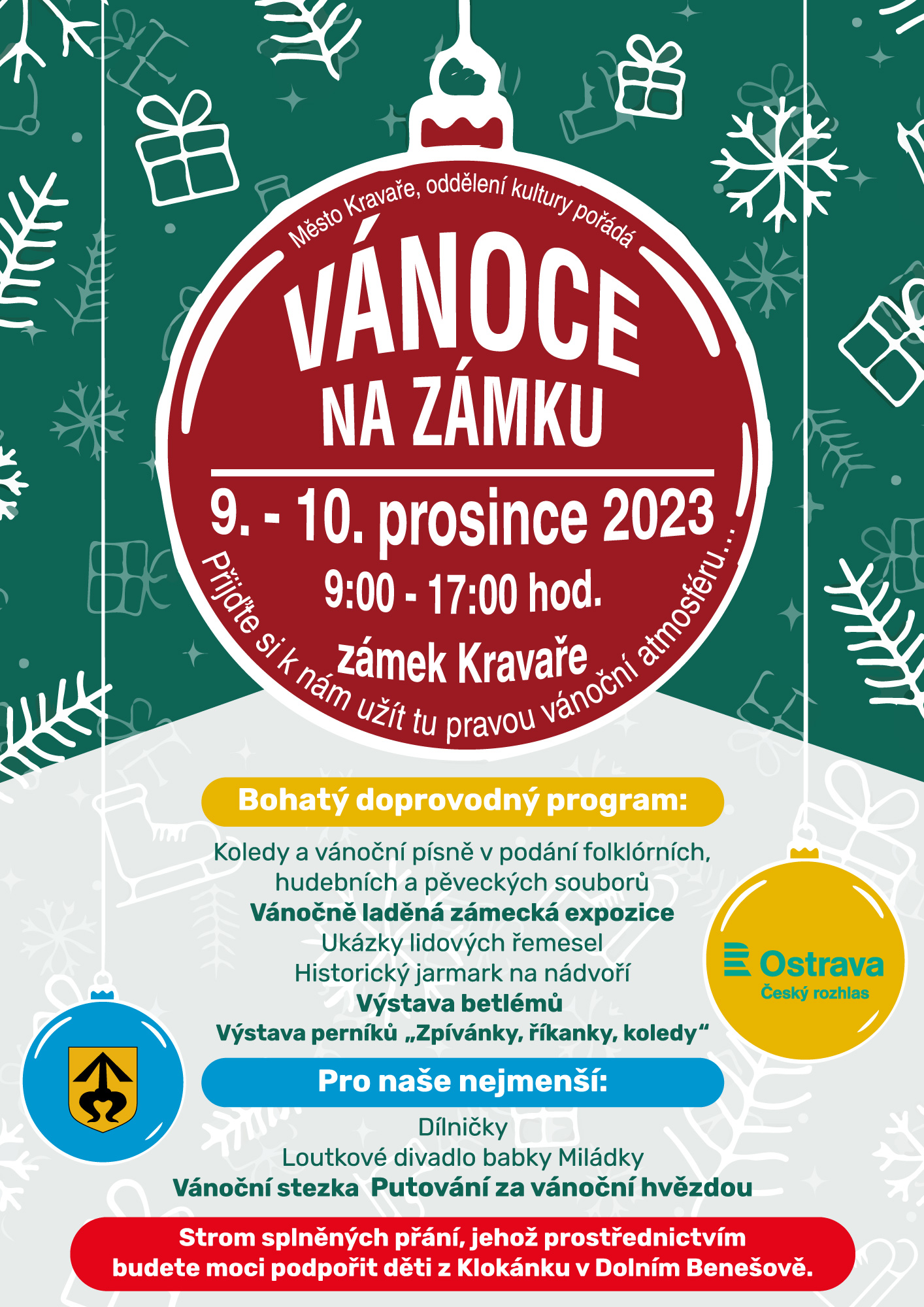 Město Kravaře zve na tradiční Vánoce na zámku, akce se bude konat 9. - 10. prosince. (program - viz. plakát)