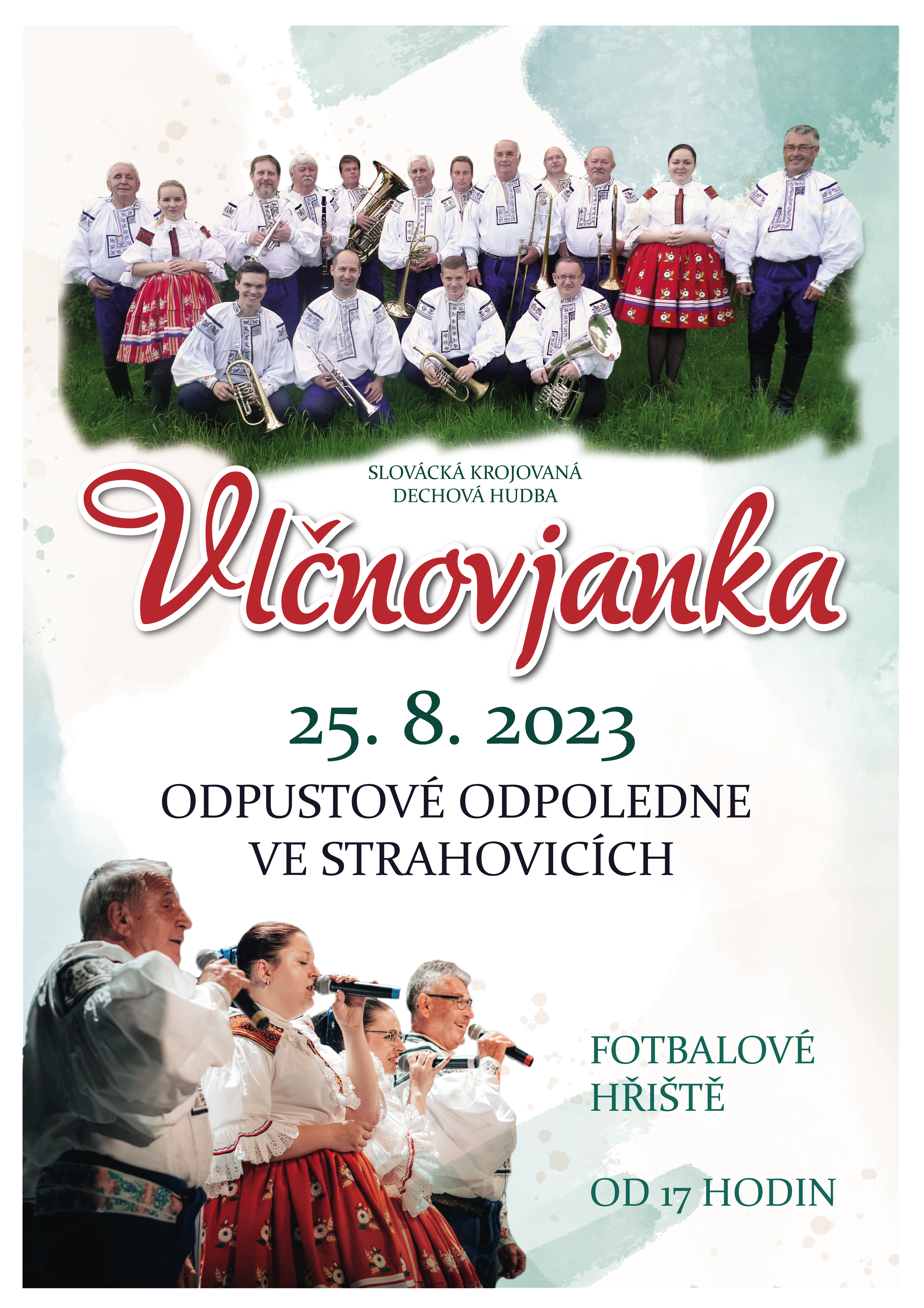 V pátek 25. 8. 2023 se ve Strahovicích uskuteční vystoupení slovácké krojované dechové hudby Vlčnovjanka. (viz. plakát)