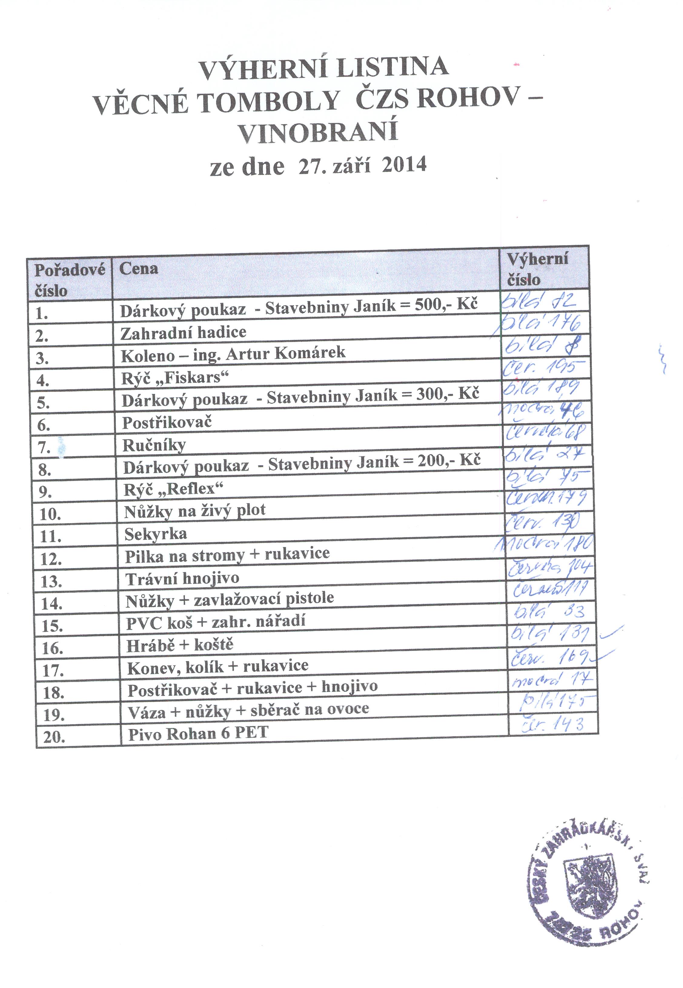 Výherní listina ČZS Rohov - VINOBRANÍ 27. září 2014