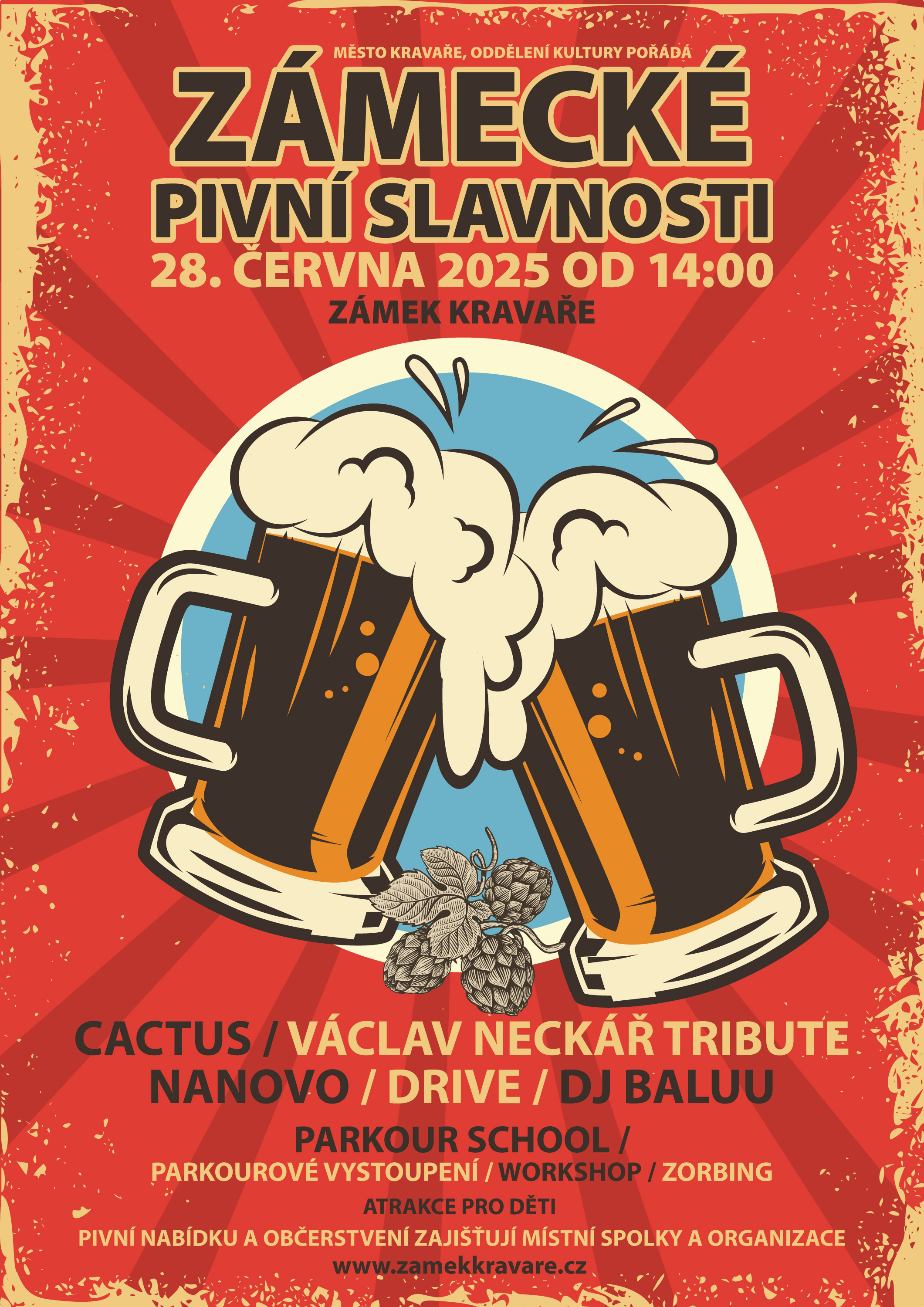 Město Kravaře, oddělení kultury pořádá akci Zámecké pivní slavnosti v sobotu 28. června 2025 od 14 hodin (viz. plakát)