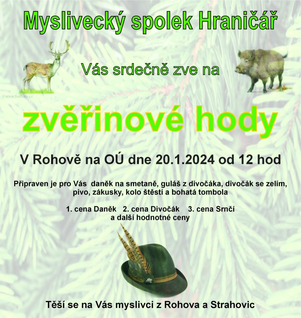 Myslivecký spolek Hraničář Vás zve na zvěřinové hody, které se budou konat v sále obecního domu v Rohově dne 20.1.2024. (viz. plakát)